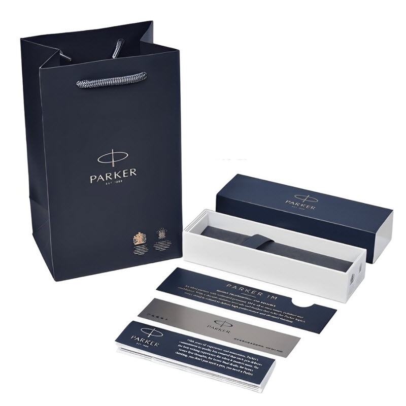 Sản phẩm bút bi ký tên Parker IM Đ-Blue Grey CT TB4-1975648 đi kèm với hộp đựng sang trọng và túi hãng chính hãng, không chỉ bảo vệ bút khỏi các va đập mà còn tăng thêm giá trị khi làm quà tặng. Hộp đựng chắc chắn, đẹp mắt, thích hợp làm quà tặng cho đối tác, bạn bè, đồng nghiệp trong các dịp đặc biệt như sinh nhật, kỷ niệm, hoặc các sự kiện quan trọng.