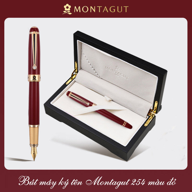Bút máy ký tên Montagut 254 màu đỏ chính hãng hộp gỗ đính đá cao cấp