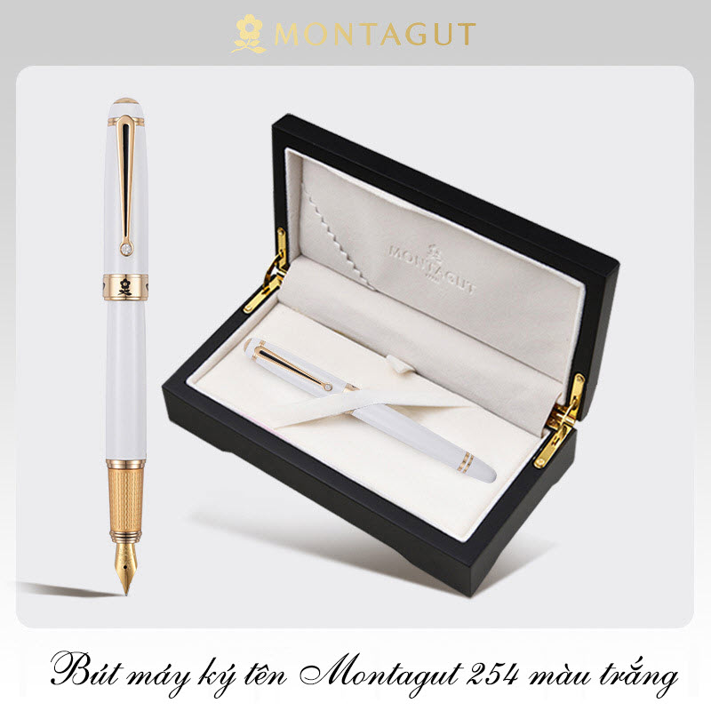 Bút máy ký tên Montagut 254 màu trắng chính hãng hộp gỗ đính đá cao cấp
