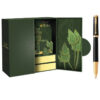 Hộp quà bút ký này sở hữu màu sắc chủ đạo là tông xanh lá đậm, mang lại cảm giác yên bình, thanh lịch nhưng không kém phần trang trọng. Màu xanh lá thường được liên tưởng đến sự phát triển bền vững, sự hài hòa với thiên nhiên, và tinh thần ổn định. Sự kết hợp với các chi tiết mạ vàng tinh xảo tạo nên một tổng thể hoàn mỹ.