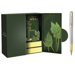Hộp quà bút ký HCM006 được lấy cảm hứng từ tác phẩm văn học “Búp Sen Xanh”, biểu tượng cho sự thanh cao và kiên định. Hình ảnh búp sen trên hộp thể hiện sự thuần khiết, vươn lên từ bùn lầy để tỏa hương, giống như hành trình cuộc đời của Chủ tịch Hồ Chí Minh.