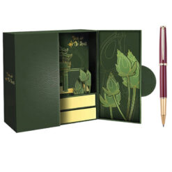 Hộp quà bút ký này sở hữu màu sắc chủ đạo là tông xanh lá đậm, mang lại cảm giác yên bình, thanh lịch nhưng không kém phần trang trọng. Màu xanh lá thường được liên tưởng đến sự phát triển bền vững, sự hài hòa với thiên nhiên, và tinh thần ổn định. Sự kết hợp với các chi tiết mạ vàng tinh xảo tạo nên một tổng thể hoàn mỹ.