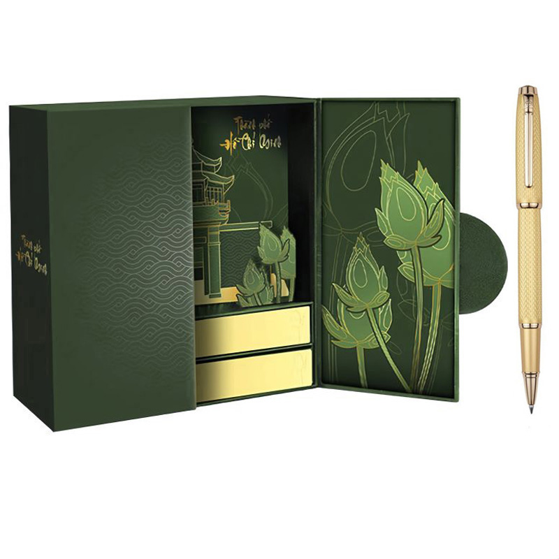 Hộp quà bút ký HCM017 được lấy cảm hứng từ tác phẩm văn học “Búp Sen Xanh”, biểu tượng cho sự thanh cao và kiên định. Hình ảnh búp sen trên hộp thể hiện sự thuần khiết, vươn lên từ bùn lầy để tỏa hương, giống như hành trình cuộc đời của Chủ tịch Hồ Chí Minh.