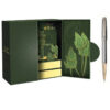 Hộp quà bút ký này sở hữu màu sắc chủ đạo là tông xanh lá đậm, mang lại cảm giác yên bình, thanh lịch nhưng không kém phần trang trọng. Màu xanh lá thường được liên tưởng đến sự phát triển bền vững, sự hài hòa với thiên nhiên, và tinh thần ổn định. Sự kết hợp với các chi tiết mạ vàng tinh xảo tạo nên một tổng thể hoàn mỹ.