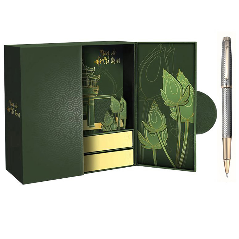 Hộp quà bút ký HCM018 được lấy cảm hứng từ tác phẩm văn học “Búp Sen Xanh”, biểu tượng cho sự thanh cao và kiên định. Hình ảnh búp sen trên hộp thể hiện sự thuần khiết, vươn lên từ bùn lầy để tỏa hương, giống như hành trình cuộc đời của Chủ tịch Hồ Chí Minh.