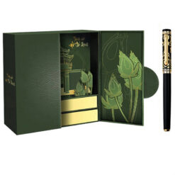 Hộp quà bút ký này sở hữu màu sắc chủ đạo là tông xanh lá đậm, mang lại cảm giác yên bình, thanh lịch nhưng không kém phần trang trọng. Màu xanh lá thường được liên tưởng đến sự phát triển bền vững, sự hài hòa với thiên nhiên, và tinh thần ổn định. Sự kết hợp với các chi tiết mạ vàng tinh xảo tạo nên một tổng thể hoàn mỹ.