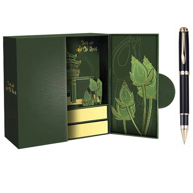 Hộp quà bút ký HCM024 được lấy cảm hứng từ tác phẩm văn học “Búp Sen Xanh”, biểu tượng cho sự thanh cao và kiên định. Hình ảnh búp sen trên hộp thể hiện sự thuần khiết, vươn lên từ bùn lầy để tỏa hương, giống như hành trình cuộc đời của Chủ tịch Hồ Chí Minh.