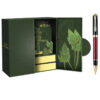 Hộp quà bút ký này sở hữu màu sắc chủ đạo là tông xanh lá đậm, mang lại cảm giác yên bình, thanh lịch nhưng không kém phần trang trọng. Màu xanh lá thường được liên tưởng đến sự phát triển bền vững, sự hài hòa với thiên nhiên, và tinh thần ổn định. Sự kết hợp với các chi tiết mạ vàng tinh xảo tạo nên một tổng thể hoàn mỹ.
