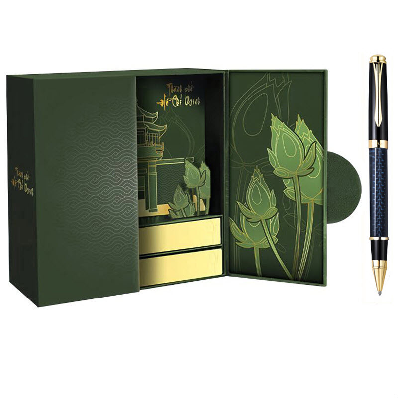 Hộp quà bút ký HCM026 được lấy cảm hứng từ tác phẩm văn học “Búp Sen Xanh”, biểu tượng cho sự thanh cao và kiên định. Hình ảnh búp sen trên hộp thể hiện sự thuần khiết, vươn lên từ bùn lầy để tỏa hương, giống như hành trình cuộc đời của Chủ tịch Hồ Chí Minh.