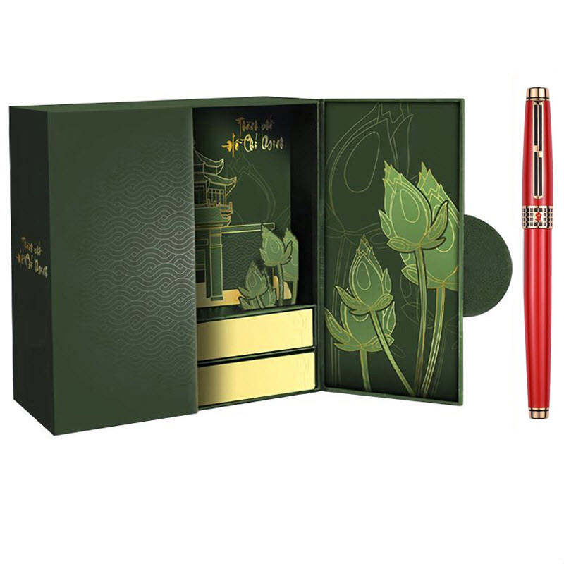 Hộp quà bút ký HCM028 được lấy cảm hứng từ tác phẩm văn học “Búp Sen Xanh”, biểu tượng cho sự thanh cao và kiên định. Hình ảnh búp sen trên hộp thể hiện sự thuần khiết, vươn lên từ bùn lầy để tỏa hương, giống như hành trình cuộc đời của Chủ tịch Hồ Chí Minh.