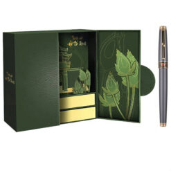 Hộp quà bút ký này sở hữu màu sắc chủ đạo là tông xanh lá đậm, mang lại cảm giác yên bình, thanh lịch nhưng không kém phần trang trọng. Màu xanh lá thường được liên tưởng đến sự phát triển bền vững, sự hài hòa với thiên nhiên, và tinh thần ổn định. Sự kết hợp với các chi tiết mạ vàng tinh xảo tạo nên một tổng thể hoàn mỹ.