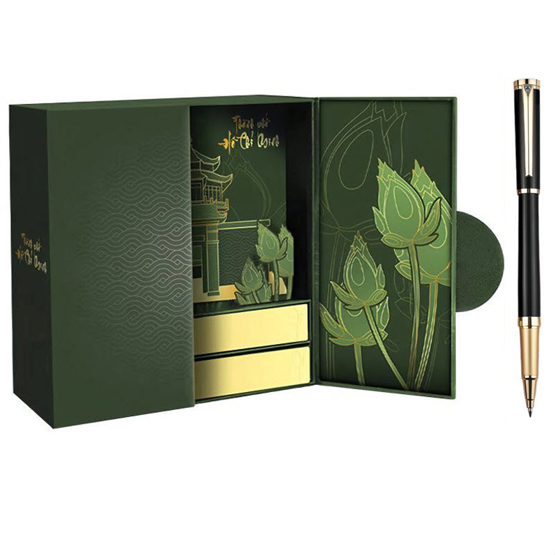 Hộp quà bút ký HCM036 được lấy cảm hứng từ tác phẩm văn học “Búp Sen Xanh”, biểu tượng cho sự thanh cao và kiên định. Hình ảnh búp sen trên hộp thể hiện sự thuần khiết, vươn lên từ bùn lầy để tỏa hương, giống như hành trình cuộc đời của Chủ tịch Hồ Chí Minh.