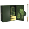 Hộp quà bút ký này sở hữu màu sắc chủ đạo là tông xanh lá đậm, mang lại cảm giác yên bình, thanh lịch nhưng không kém phần trang trọng. Màu xanh lá thường được liên tưởng đến sự phát triển bền vững, sự hài hòa với thiên nhiên, và tinh thần ổn định. Sự kết hợp với các chi tiết mạ vàng tinh xảo tạo nên một tổng thể hoàn mỹ.