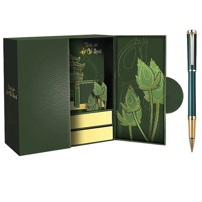 Hộp quà bút ký HCM039 được lấy cảm hứng từ tác phẩm văn học “Búp Sen Xanh”, biểu tượng cho sự thanh cao và kiên định. Hình ảnh búp sen trên hộp thể hiện sự thuần khiết, vươn lên từ bùn lầy để tỏa hương, giống như hành trình cuộc đời của Chủ tịch Hồ Chí Minh.