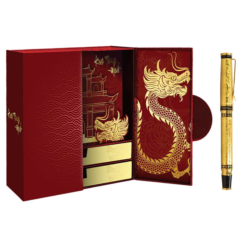 Hộp quà bút ký HUE001 gói gọn và hội tụ tinh hoa Cố đô Huế, với từng chi tiết mang đậm hào khí Việt Nam. Sắc đỏ yêu nước, rồng vàng quyền lực, cổng thành kiên cố – tất cả hòa quyện, trở thành biểu tượng bất diệt của tinh thần dân tộc.
