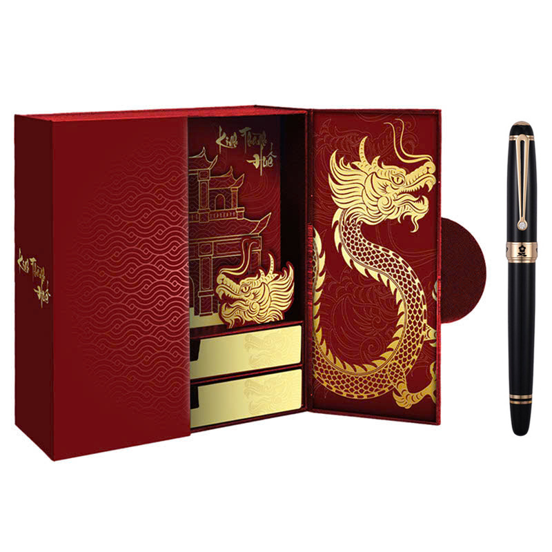 Hộp quà bút ký chủ đề Kinh thành Huế có thiết kế cánh bướm với gam màu đỏ thẫm tượng trưng cho may mắn, được trang trí bằng các chi tiết vàng tỉ mỉ. Họa tiết rồng và Kinh thành Huế tạo nên nghệ thuật mang đậm giá trị văn hóa, thể hiện rõ chủ đề “Hào Khí Cố Đô”.