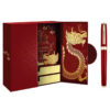 Hộp quà bút ký chủ đề Kinh thành Huế có thiết kế cánh bướm với gam màu đỏ thẫm tượng trưng cho may mắn, được trang trí bằng các chi tiết vàng tỉ mỉ. Họa tiết rồng và Kinh thành Huế tạo nên nghệ thuật mang đậm giá trị văn hóa, thể hiện rõ chủ đề “Hào Khí Cố Đô”.