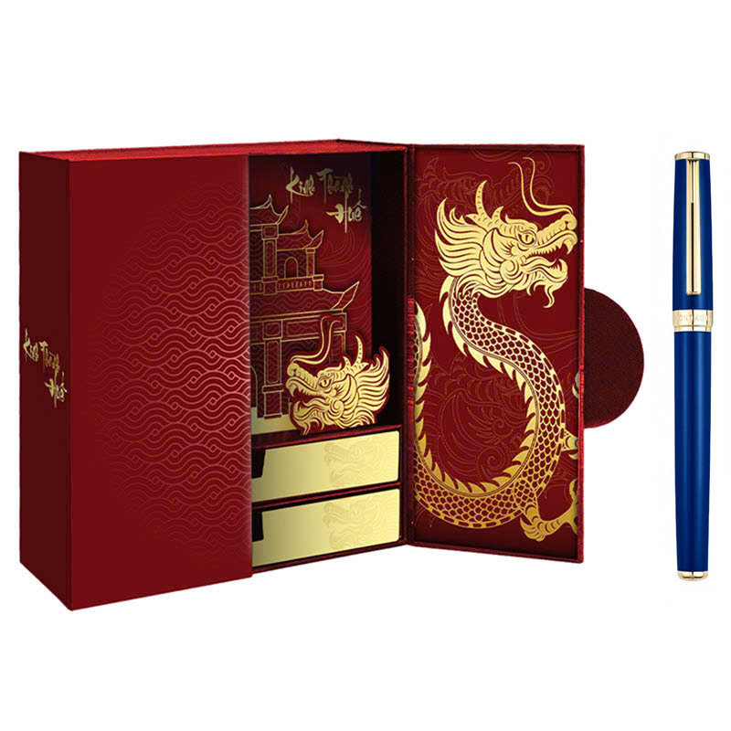Hộp quà bút ký HUE011 gói gọn và hội tụ tinh hoa Cố đô Huế, với từng chi tiết mang đậm hào khí Việt Nam. Sắc đỏ yêu nước, rồng vàng quyền lực, cổng thành kiên cố – tất cả hòa quyện, trở thành biểu tượng bất diệt của tinh thần dân tộc.