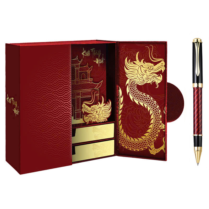 Hộp quà bút ký HUE025 gói gọn và hội tụ tinh hoa Cố đô Huế, với từng chi tiết mang đậm hào khí Việt Nam. Sắc đỏ yêu nước, rồng vàng quyền lực, cổng thành kiên cố – tất cả hòa quyện, trở thành biểu tượng bất diệt của tinh thần dân tộc.