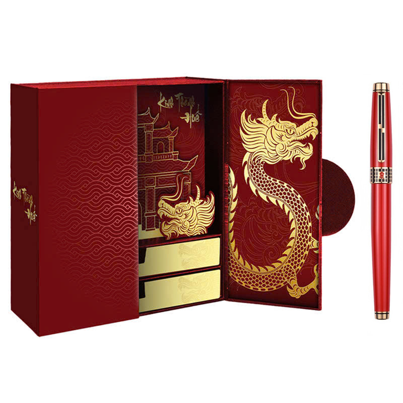 Hộp quà bút ký HUE028 gói gọn và hội tụ tinh hoa Cố đô Huế, với từng chi tiết mang đậm hào khí Việt Nam. Sắc đỏ yêu nước, rồng vàng quyền lực, cổng thành kiên cố – tất cả hòa quyện, trở thành biểu tượng bất diệt của tinh thần dân tộc.