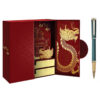 Hộp quà bút ký chủ đề Kinh thành Huế có thiết kế cánh bướm với gam màu đỏ thẫm tượng trưng cho may mắn, được trang trí bằng các chi tiết vàng tỉ mỉ. Họa tiết rồng và Kinh thành Huế tạo nên nghệ thuật mang đậm giá trị văn hóa, thể hiện rõ chủ đề “Hào Khí Cố Đô.”