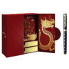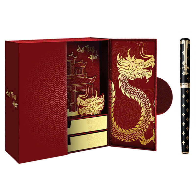 Hộp quà bút ký chủ đề Kinh thành Huế có thiết kế cánh bướm với gam màu đỏ thẫm tượng trưng cho may mắn, được trang trí bằng các chi tiết vàng tỉ mỉ. Họa tiết rồng và Kinh thành Huế tạo nên nghệ thuật mang đậm giá trị văn hóa, thể hiện rõ chủ đề “Hào Khí Cố Đô.”