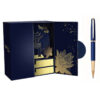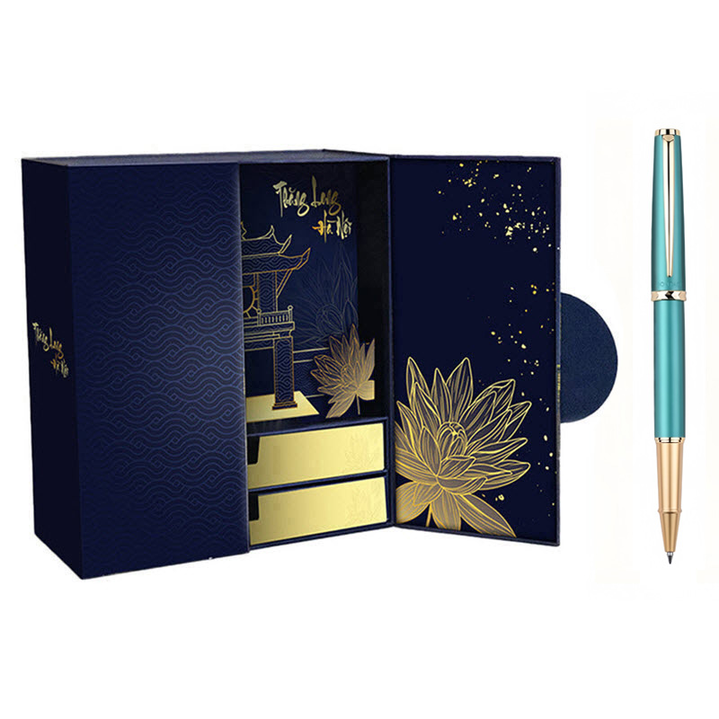 Hộp quà bút ký TLHN022 lấy màu xanh đậm làm chủ đạo cùng hoạ tiết gợn sóng trên bề mặt tạo cảm giác thanh nhã và hài hoà, .Ở trung tâm là hình ảnh của Khuê Văn Các biểu tượng kiến trúc truyền thống nổi tiếng tại Văn Miếu – Quốc Tử Giám, gợi lên nét văn hóa và lịch sử lâu đời của Việt Nam. Bên trong hộp, hoa văn nổi bật với hình ảnh Khuê Văn Các và hoa sen vàng – biểu tượng quốc hoa của Việt Nam, đại diện cho sự thuần khiết, cao quý và niềm tự hào dân tộc.