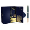 Hộp quà bút ký TLHN024 lấy màu xanh đậm làm chủ đạo cùng hoạ tiết gợn sóng trên bề mặt tạo cảm giác thanh nhã và hài hoà, .Ở trung tâm là hình ảnh của Khuê Văn Các biểu tượng kiến trúc truyền thống nổi tiếng tại Văn Miếu – Quốc Tử Giám, gợi lên nét văn hóa và lịch sử lâu đời của Việt Nam. Bên trong hộp, hoa văn nổi bật với hình ảnh Khuê Văn Các và hoa sen vàng – biểu tượng quốc hoa của Việt Nam, đại diện cho sự thuần khiết, cao quý và niềm tự hào dân tộc.