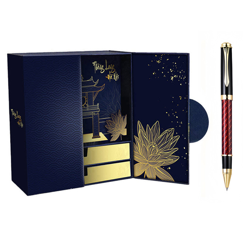 Hộp quà bút ký TLHN025 lấy màu xanh đậm làm chủ đạo cùng hoạ tiết gợn sóng trên bề mặt tạo cảm giác thanh nhã và hài hoà, .Ở trung tâm là hình ảnh của Khuê Văn Các biểu tượng kiến trúc truyền thống nổi tiếng tại Văn Miếu – Quốc Tử Giám, gợi lên nét văn hóa và lịch sử lâu đời của Việt Nam. Bên trong hộp, hoa văn nổi bật với hình ảnh Khuê Văn Các và hoa sen vàng – biểu tượng quốc hoa của Việt Nam, đại diện cho sự thuần khiết, cao quý và niềm tự hào dân tộc.