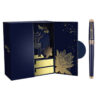Hộp quà bút ký TLHN031 lấy màu xanh đậm làm chủ đạo cùng hoạ tiết gợn sóng trên bề mặt tạo cảm giác thanh nhã và hài hoà, .Ở trung tâm là hình ảnh của Khuê Văn Các biểu tượng kiến trúc truyền thống nổi tiếng tại Văn Miếu – Quốc Tử Giám, gợi lên nét văn hóa và lịch sử lâu đời của Việt Nam. Bên trong hộp, hoa văn nổi bật với hình ảnh Khuê Văn Các và hoa sen vàng – biểu tượng quốc hoa của Việt Nam, đại diện cho sự thuần khiết, cao quý và niềm tự hào dân tộc.